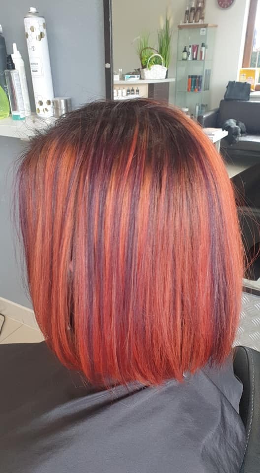Wyrazista koloryzacja w ognistych odcieniach czerwieni i fioletu na klasycznym bobie – pełna charakteru i energii.